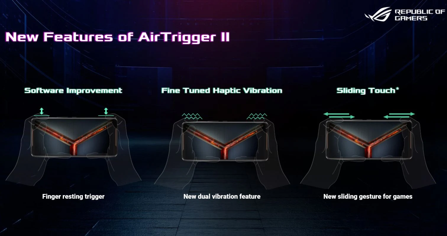 Bukan smartphone gaming sejati jika tak didukung oleh fitur pendukung aktivitas bermain game yang lengkap. Asus yang telah berpengalaman menghadirkan aneka fitur inovatif di laptop gaming lini ROG dan TUF Gaming sudah mengerti fitur apa yang dibutuhkan gamer mobile. Salah satu fitur unggulan Asus ROG Phone II adalah Air Trigger II. Fitur Air Trigger II memanfaatkan sensor ultrasonik yang dapat membuat sudut atau frame ponsel ROG Phone II menjadi tombol kontrol tambahan.Hadirnya fitur Air Trigger II ini tentu membuat gamer tak perlu repot dengan hanya mengandalkan kedua ibu jari saat bermain game, tetapi juga dapat memanfaatkan jari telunjuk untuk mengoperasikan tombol tambahan. Air Trigger II ini telah hadir dengan algoritma baru yang lebih cerdas, latensi getaran yang telah ditingkatkan menjadi 20ms yang membuatnya menjadi kian sensitif, dan mendukung gerakan baru. Tak hanya gestur menekan, Air Trigger II juga dapat digunakan dengan gesture sliding dan resting finger.