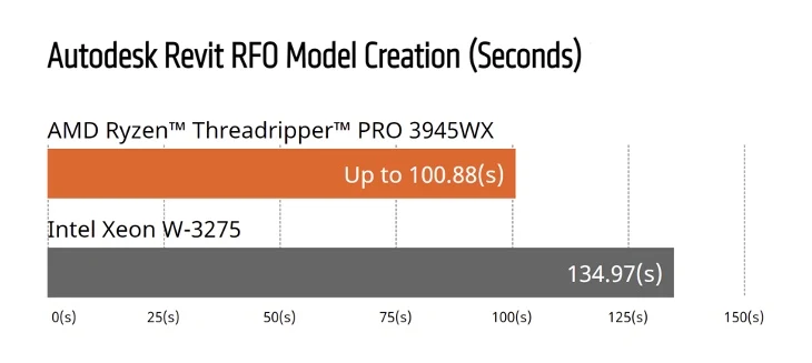 Hal ini juga mendorong perakitan ulang yang lebih cepat untuk desainer yang menghasilkan pengalaman yang lebih mulus bagi pengguna akhir. Seperti yang terlihat pada Gambar 1, prosesor AMD Ryzen Threadripper PRO 3945WX saat ini hingga 35 persen lebih cepat di Autodesk Revit RFO, dibandingkan prosesor workstation pesaing.