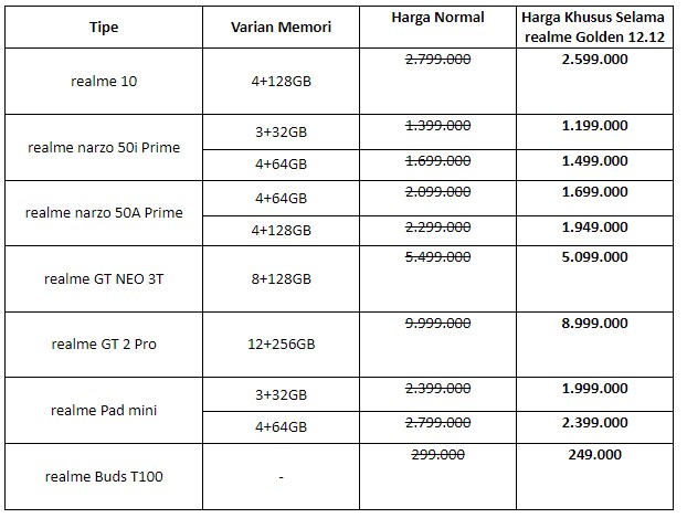 Sebagai bagian dari kegiatan realme Golden Carnival “Let It Gold” yang menawarkan total hadiah sampai Rp20 miliar, realme Golden 12.12 akan menghadirkan seluruh seri smartphone terbaik dari realme C Series, Number Series, sampai GT Series. Tidak hanya itu berbagai produk AIoT juga ikut diberikan diskon besar. Selama tiga hari penuh yakni pada 12 hingga 14 Desember para anak muda diberikan kesempatan membeli produk trendi realme impian dengan harga terbaik.