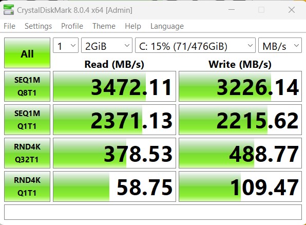 SSD Samsung PM9A1 MZVL2512HCJQ yang digunakan oleh laptop gaming terjangkau HP Victus 15 FB0009AX menghasilkan transfer rate 3472.11 MB/s untuk write dan 3226.42 MB/s untuk write di CrystalDiskMark.